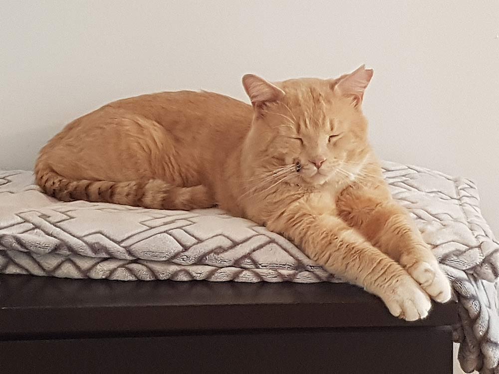 This new guy sure looks content, and at home. I hope he is able to push a little harder on the heartstrings, and become a permanent resident. Maybe something to think about Marko is to build a kitty condo. This would allow him out into the backyard, and he wouldn't be wandering the streets getting into fights. Something else that might work if you people have the time is to train him on a leash and take him walking for his safety, and your peace of mind. Peaches! I think that's a neat name, it suits his colouring. Now you will just have to find cream to keep him company.